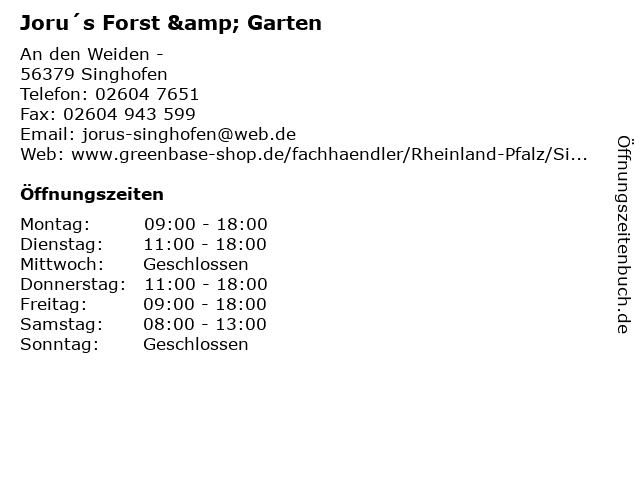 | Öffnungszeiten Joru´s Forst & Garten in Singhofen anzeigen | |