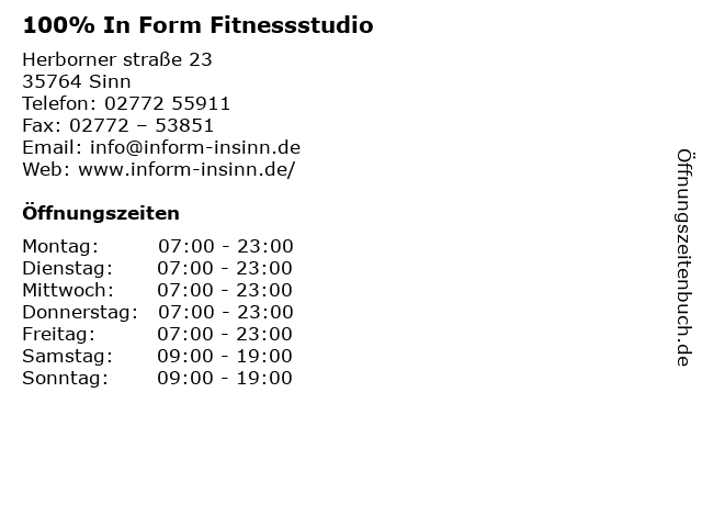 | Öffnungszeiten 100% In Form Fitnessstudio in Sinn anzeigen | |