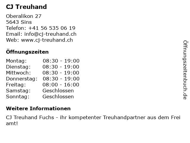 | Öffnungszeiten CJ Treuhand in Sins anzeigen | |