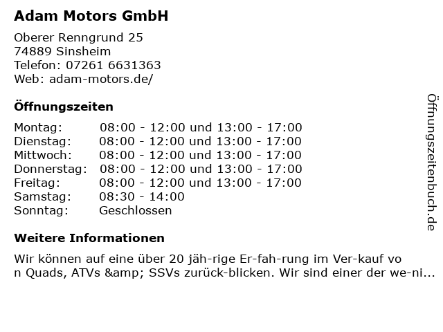 | Öffnungszeiten Adam Motors GmbH in Sinsheim anzeigen | |