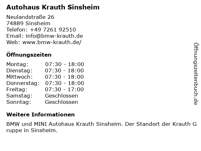 | Öffnungszeiten Autohaus Krauth Sinsheim in Sinsheim anzeigen | |