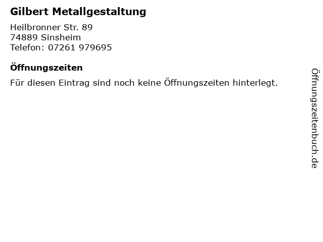 | Öffnungszeiten Gilbert Metallgestaltung in Sinsheim anzeigen | |