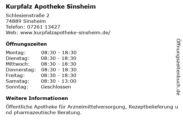 | Öffnungszeiten Kurpfalz Apotheke Sinsheim in Sinsheim anzeigen | |