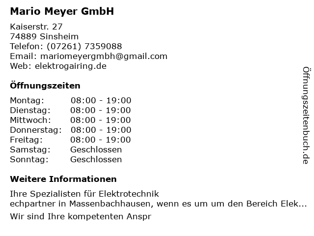 | Öffnungszeiten Mario Meyer GmbH in Sinsheim anzeigen | |