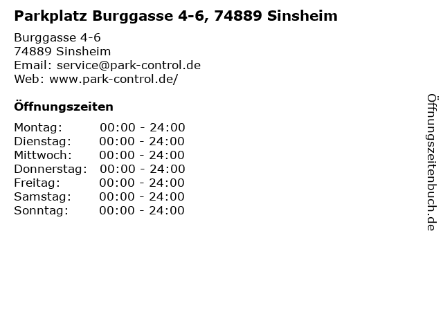 | Öffnungszeiten Parkplatz Burggasse 4-6, 74889 Sinsheim in Sinsheim anzeigen | |