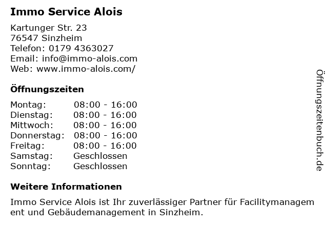 | Öffnungszeiten Immo Service Alois in Sinzheim anzeigen | |