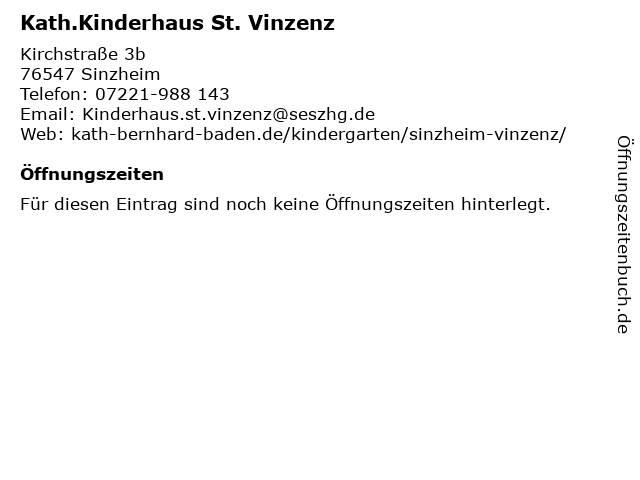 | Öffnungszeiten Kath.Kinderhaus St. Vinzenz in Sinzheim anzeigen | |