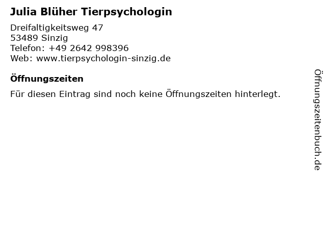 | Öffnungszeiten Julia Blüher Tierpsychologin in Sinzig anzeigen | |