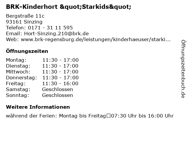 | Öffnungszeiten BRK-Kinderhort "Starkids" in Sinzing anzeigen | |