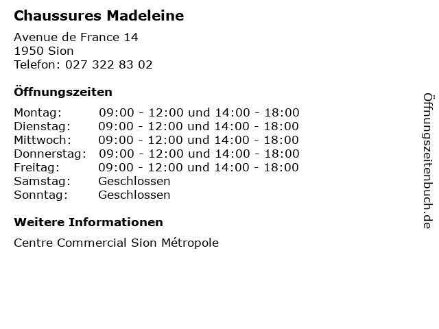 | Öffnungszeiten Chaussures Madeleine in Sion anzeigen | |