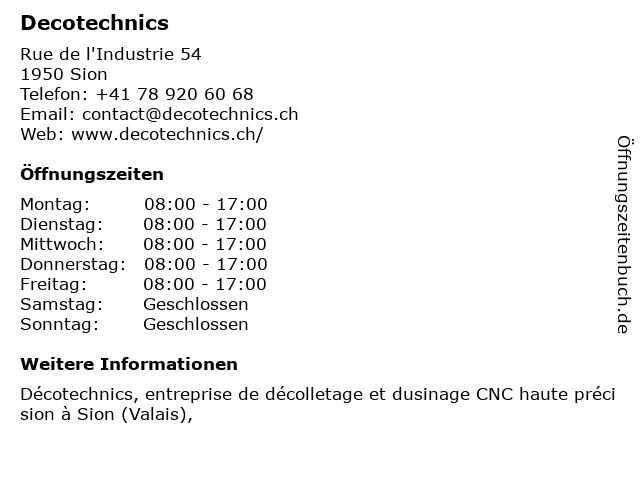 | Öffnungszeiten Decotechnics in Sion anzeigen | |