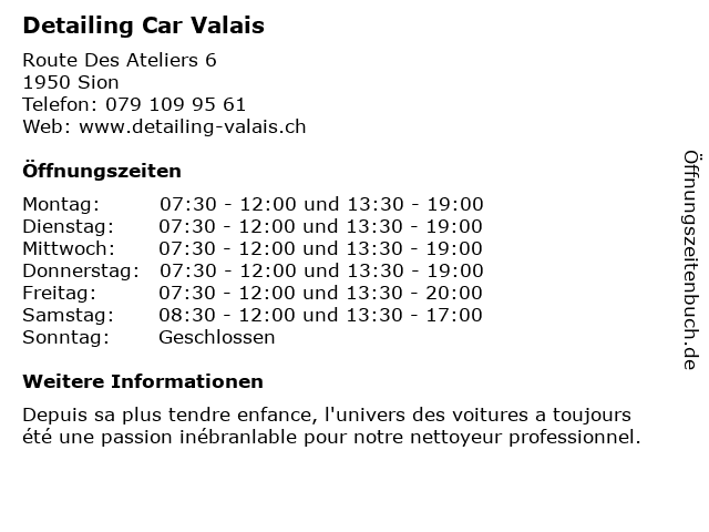 | Öffnungszeiten Detailing Car Valais in Sion anzeigen | |