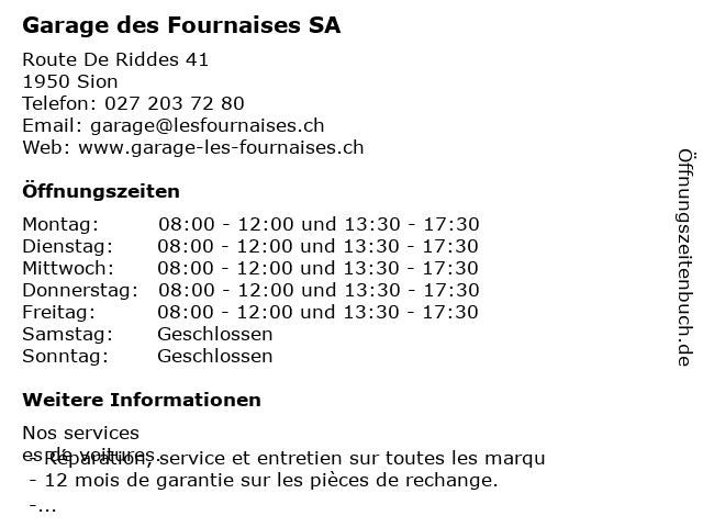 | Öffnungszeiten Garage des Fournaises SA in Sion anzeigen | |