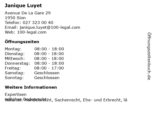 | Öffnungszeiten Janique Luyet in Sion anzeigen | |