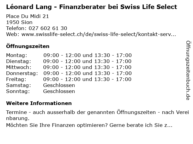 1 Boris Bonnard - Finanzberater bei Swiss Life Select (Entfernung: 0,00 km) Place Du Midi 21, 1950 Sion 2 Lise Mathieu - Finanzberaterin bei Swiss Life Select (Entfernung: 0,00 km) Place Du Midi 21, 1950 Sion 3 Amaury Dunand - Finanzberater bei Swiss Life Select (Entfernung: 0,00 km) Place Du Midi 21, 1950 Sion 4 Sébastien Bruchez - Finanzberater bei Swiss Life Select (Entfernung: 0,00 km) Place Du Midi 21, 1950 Sion 5 Julien Mottiez - Finanzberater bei Swiss Life Select (Entfernung: 0,00 km) Place Du Midi 21, 1950 Sion 6 |