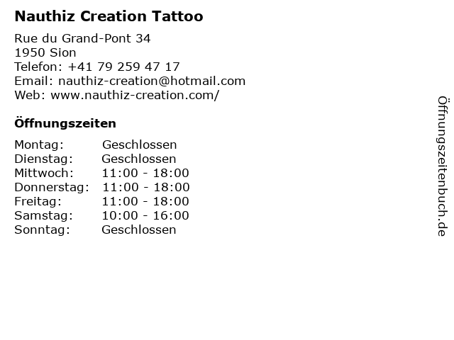 | Öffnungszeiten Nauthiz Creation Tattoo in Sion anzeigen | |