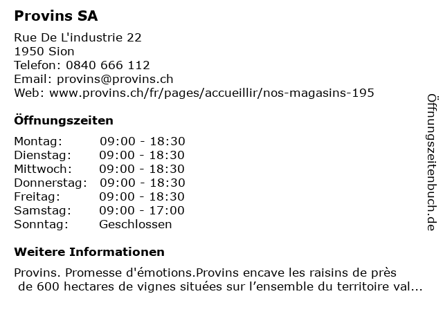| Öffnungszeiten Provins SA in Sion anzeigen | |