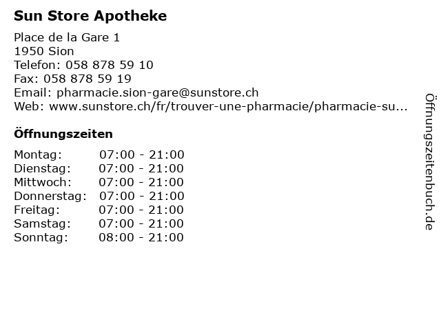 | Öffnungszeiten Sun Store Apotheke in Sion anzeigen | |