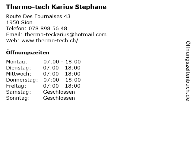 | Öffnungszeiten Thermo-tech Karius Stephane in Sion anzeigen | |