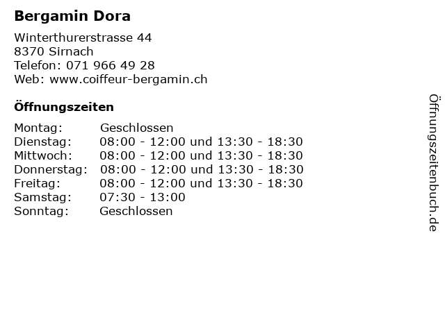 | Öffnungszeiten Bergamin Dora in Sirnach anzeigen | |