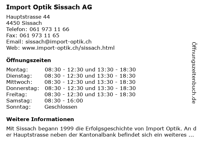 | Öffnungszeiten Import Optik Sissach AG in Sissach anzeigen | |