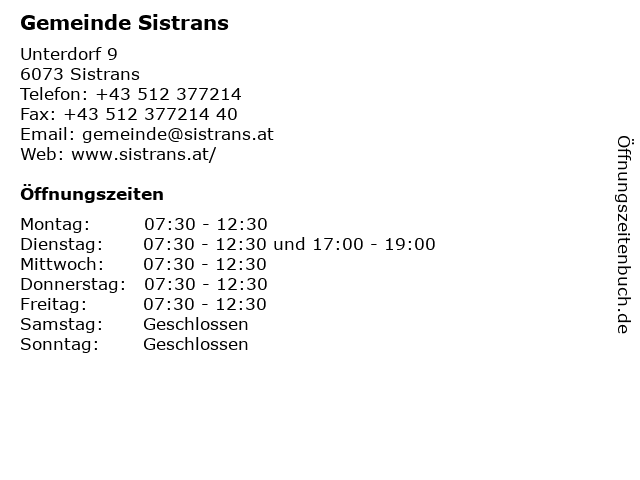 | Öffnungszeiten Gemeinde Sistrans in Sistrans anzeigen | |