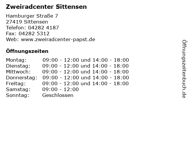 | Öffnungszeiten Zweiradcenter Sittensen in Sittensen anzeigen | |