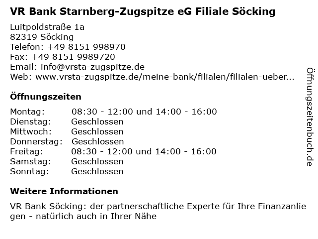 2 VR Bank Starnberg-Herrsching-Landsberg eG, Filiale Börsencenter Starnberg (Entfernung: 1,83 km) Hauptstraße 21, 82319 Starnberg 3 VR Bank Starnberg-Herrsching-Landsberg eG (Zentrale) (Entfernung: 1,86 km) Tutzinger-Hof-Platz 4, 82319 Starnberg 4 VR Bank Starnberg-Herrsching-Landsberg eG - (Geldautomat Herrsching) (Entfernung: 1,87 km) Tutzinger-Hof-Platz 8, 82319 Starnberg 5 VR Bank Starnberg-Herrsching-Landsberg eG - (Geldautomat Börsencenter) (Entfernung: 1,87 km) Tutzinger-Hof-Platz 8, 82319 Starnberg 6 VR Bank Perchting - Filiale der VR Bank Starnberg-Herrsching-Landsberg eG (Entfernung: 3,33 km) Römerstraße 9, 82319 Perchting |
