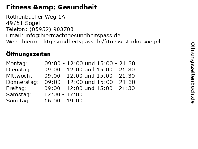| Öffnungszeiten Fitness & Gesundheit in Sögel anzeigen | |