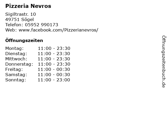 | Öffnungszeiten Pizzeria Nevros in Sögel anzeigen | |