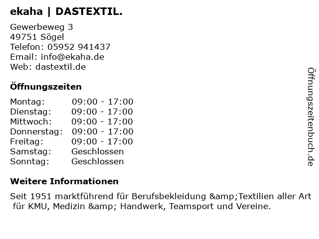 | Öffnungszeiten ekaha | DASTEXTIL. in Sögel anzeigen | |