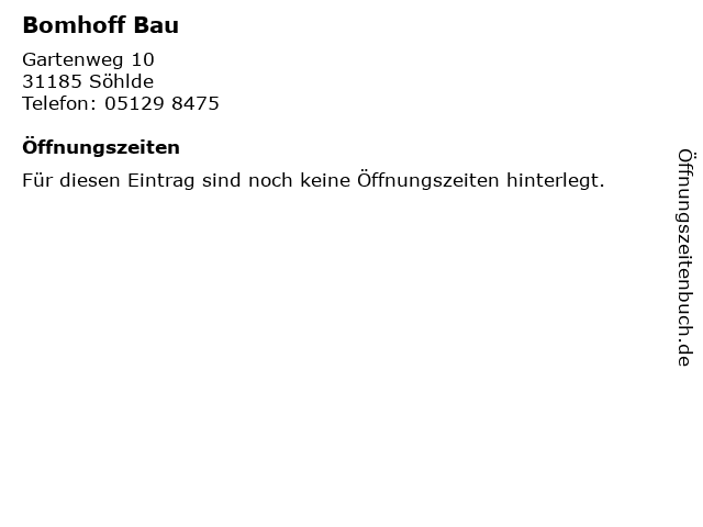 | Öffnungszeiten Bomhoff Bau in Söhlde anzeigen | |