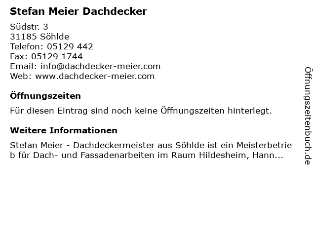 | Öffnungszeiten Stefan Meier Dachdecker in Söhlde anzeigen | |