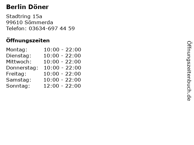 | Öffnungszeiten Berlin Döner in Sömmerda anzeigen | |
