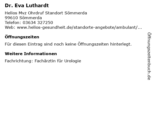 | Öffnungszeiten Dr. Eva Luthardt in Sömmerda anzeigen | |