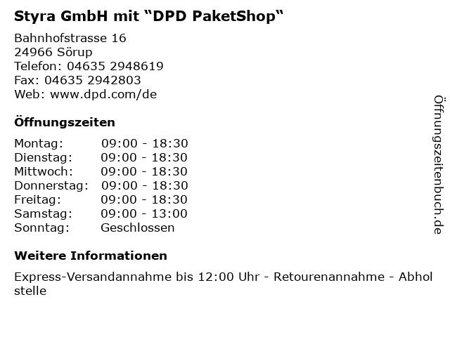 | Öffnungszeiten Styra GmbH mit “DPD PaketShop“ in Sörup anzeigen | |