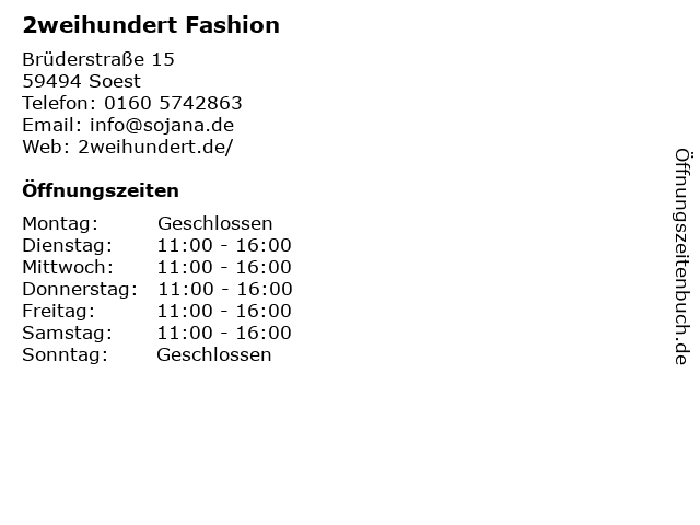 | Öffnungszeiten 2weihundert Fashion in Soest anzeigen | |