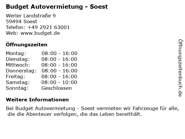 | Öffnungszeiten Budget Autovermietung - Soest in Soest anzeigen | |
