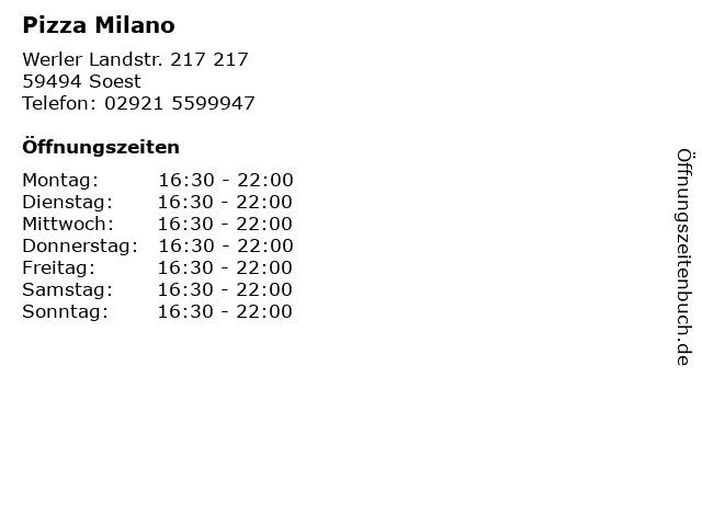 | Öffnungszeiten Pizza Milano in Soest anzeigen | |