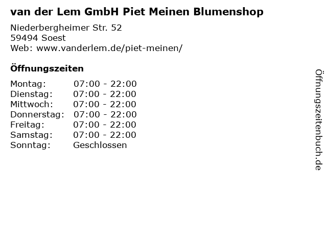 | Öffnungszeiten van der Lem GmbH Piet Meinen Blumenshop in Soest anzeigen | |