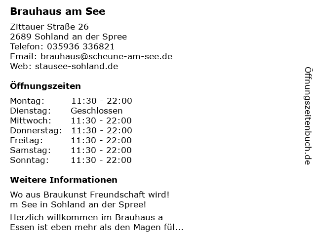 | Öffnungszeiten Brauhaus am See in Sohland an der Spree anzeigen | |