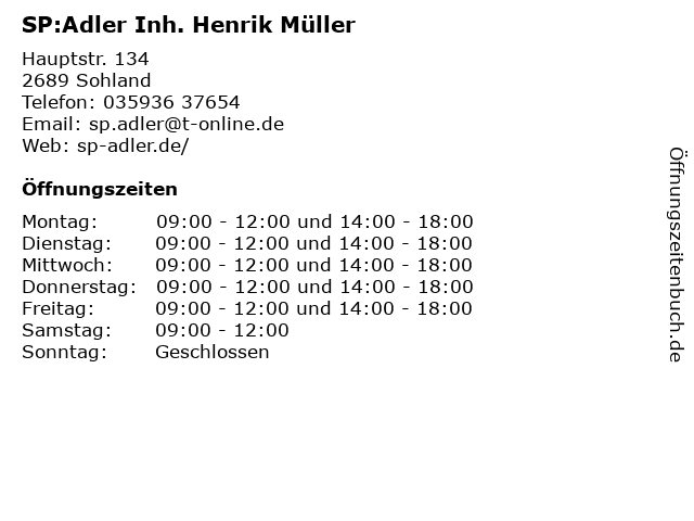 | Öffnungszeiten SP:Adler Inh. Henrik Müller in Sohland anzeigen | |