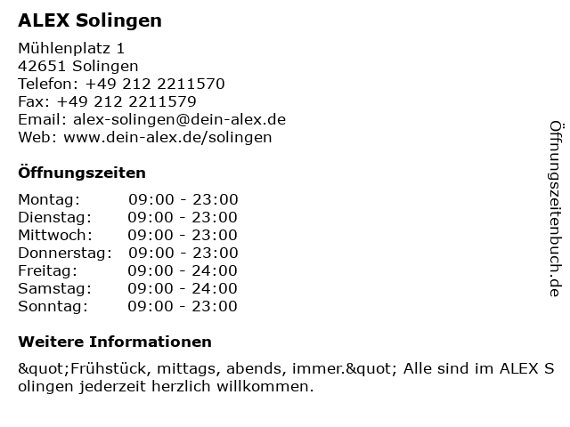 | Öffnungszeiten ALEX Solingen in Solingen anzeigen | |