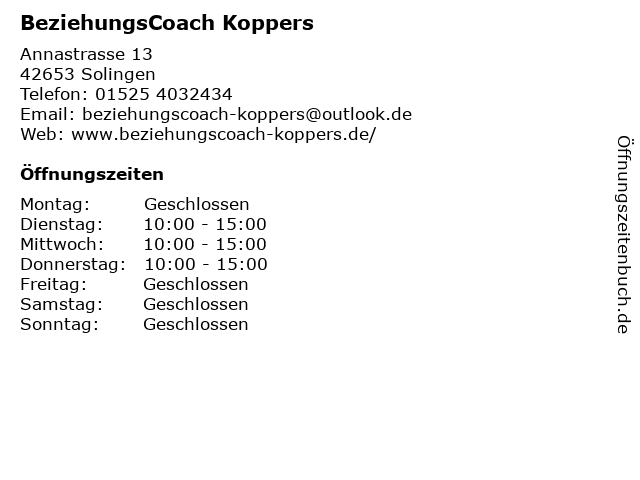 | Öffnungszeiten BeziehungsCoach Koppers in Solingen anzeigen | |