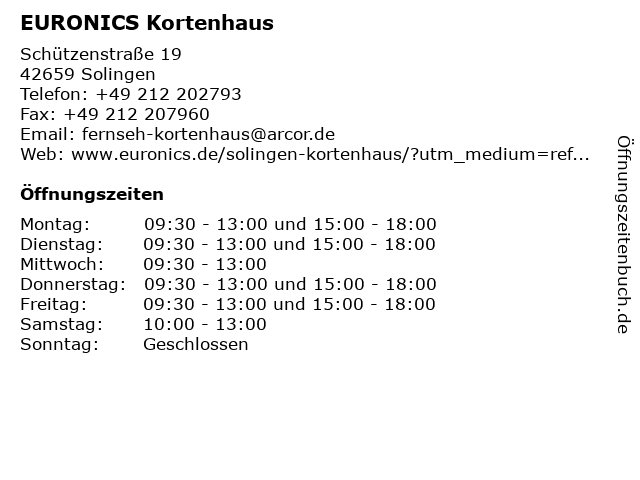 | Öffnungszeiten EURONICS Kortenhaus in Solingen anzeigen | |