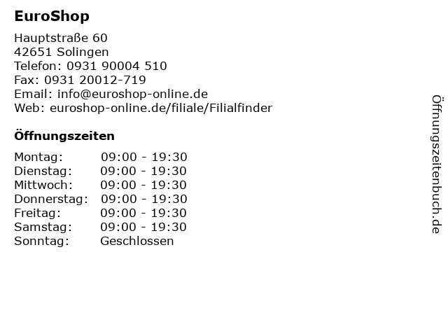 | Öffnungszeiten EuroShop in Solingen anzeigen | |
