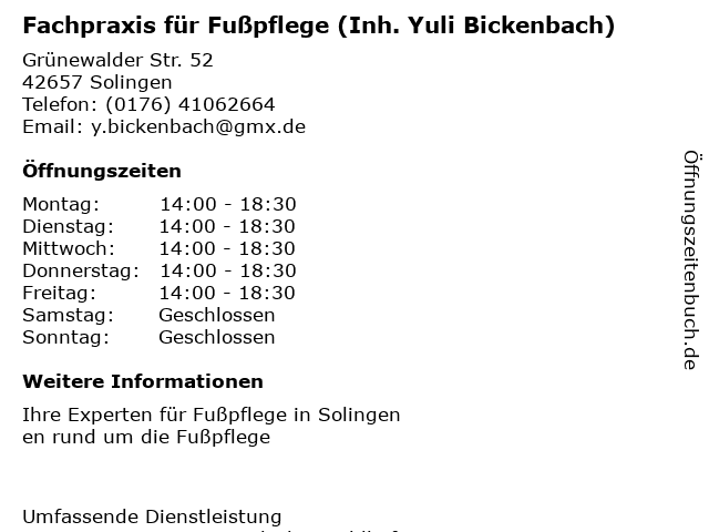 1 J. Rotthaus Medizinische Fußpflege, B. Rotthaus (Entfernung: 4,29 km) Untenflachsberg 18, 42653 Solingen 5 Kosmetiksalon Kornelia Kosmetik- und Fußpflege (Entfernung: 8,81 km) Sonnborner Str. 106, 42327 Wuppertal 6 |