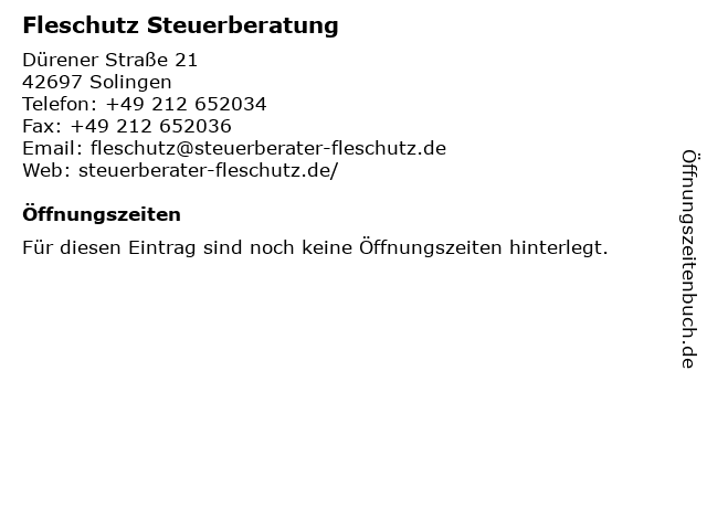 | Öffnungszeiten Fleschutz Steuerberatung in Solingen anzeigen | |