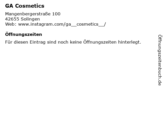 | Öffnungszeiten GA Cosmetics in Solingen anzeigen | |