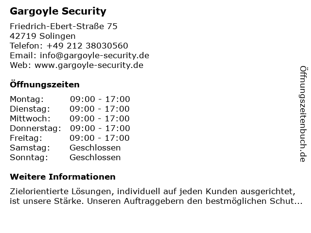 | Öffnungszeiten Gargoyle Security in Solingen anzeigen | |